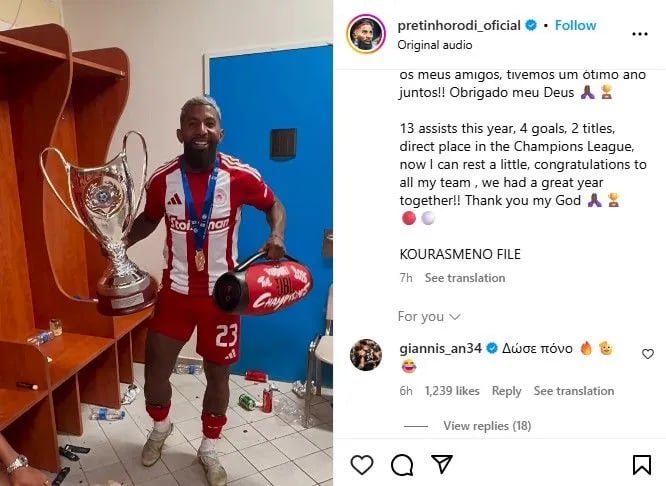 Ο Βραζιλιάνος από τα… Καμίνια, Ροντινέι, ανέβασε ένα ακόμα επικό video στο Instagram από τα αποδυτήρια του ΟΑΚΑ υπό τους ήχους του «Πανσέληνος» της Βανδή με τον Γιάννη Αντετοκούνμπο να τού σχολιάζει από κάτω: «Δώσε πόνο». Φυσικά το σχόλιο του Έλληνα σούπερ σταρ του NBA έγινε αμέσως viral συγκεντρώνοντας χιλιάδες λάικ.