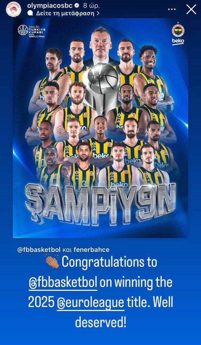 Συγκεκριμένα οι Πειραιώτες μέσω Instagram story έγραψαν: «Συγχαρητήρια στη Φενέρ για την κατάκτηση του τίτλου της Euroleague 2025. Το αξίζατε», ενώ σε ανάλογο τόνο ήταν και η ανάρτηση της ΚΑΕ ΠΑΟ.