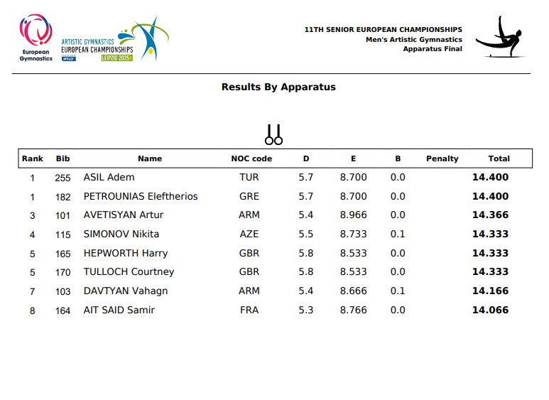 Με 8.700 στην εκτέλεση και 5.7 βαθμό δυσκολίας, ο Λευτέρης Πετρούνιας συγκέντρωσε 14.400 βαθμούς από τους κριτές και απέσπασε το χρυσό μετάλλιο μαζί με τον Τούρκο Αντέμ Ασίλ (ίδια βαθμολογία με ίδιο βαθμό εκτέλεσης και δυσκολίας).
