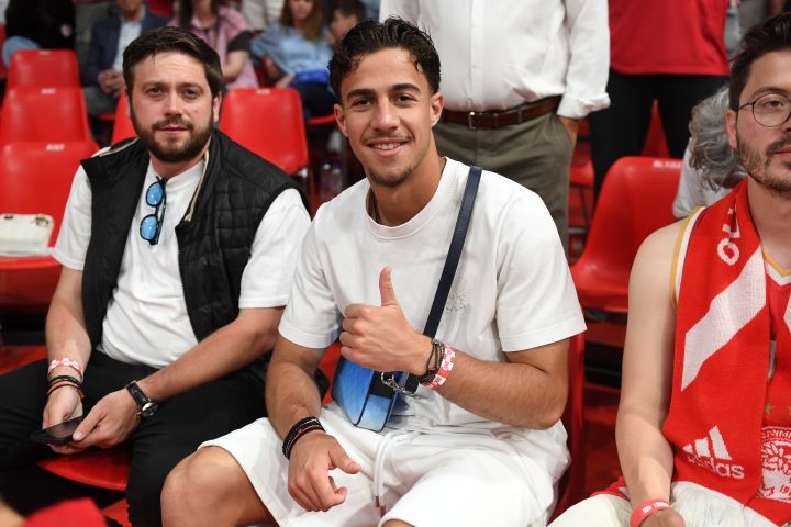 Ο Έλληνας ποδοσφαιριστής του Ολυμπιακού βρέθηκε στο πλευρό της μπασκετικής ομάδας, η οποία ψάχνει ισοφάριση στους τελικούς του πρωταθλήματος μετά την ήττα στο πρώτο παιχνίδι στο ΟΑΚΑ.
