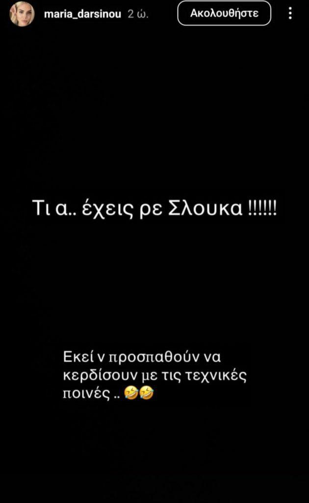 Η σύζυγός του, Μαρία Δαρσινού, έστειλε μήνυμα υποστήριξης στον αρχηγό του Παναθηναϊκού με την ατάκα: «τι αρ@@ια έχεις ρε Σλούκα», ενώ σχολίασε και τη διαιτησία γράφοντας: