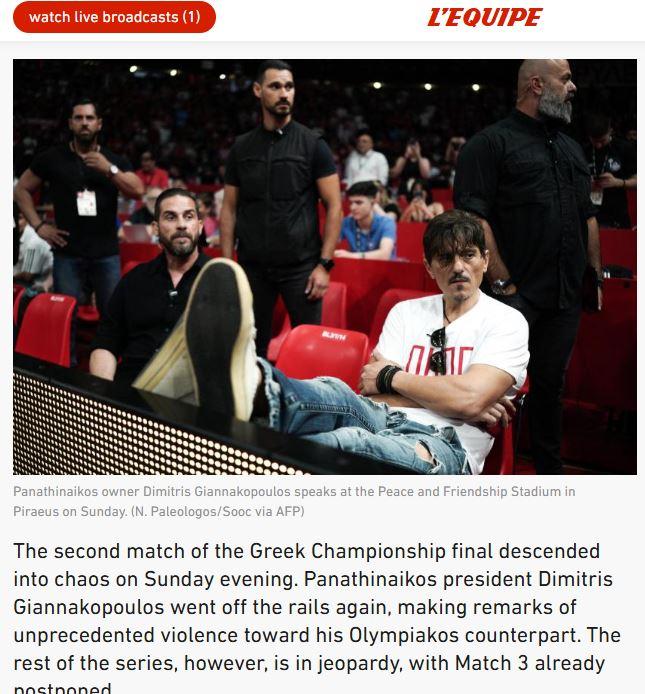 Το κορυφαίο γαλλικό Μέσο, η έγκυρη «L’ Equipe» ανέφερε μεταξύ άλλων: «Ο πρόεδρος του Παναθηναϊκού Δημήτρης Γιαννακόπουλος εκτροχιάστηκε ξανά»