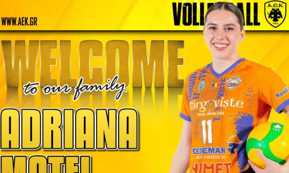 «Η ΑΕΚ ανακοινώνει την έναρξη της συνεργασίας της με την Αντριάνα Ματέι. Η 27χρονη (24/05/1998) ακραία, ύψους 1,78 μ., υπέγραψε το συμβόλαιό της και εντάσσεται στο δυναμικό της γυναικείας ομάδας Βόλεϊ του Συλλόγου.