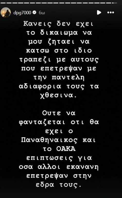 Ο Δημήτρης Γιαννακόπουλος χτύπησε ξανά μέσω Instagram Story τα ξημερώματα της Τρίτης (2/6) και τόνισε πως κανείς δεν έχει το δικαίωμα να του ζητήσει να κάτσει στο ίδιο τραπέζι με όσους επέτρεψαν να συμβούν τα γεγονότα στο ΣΕΦ.