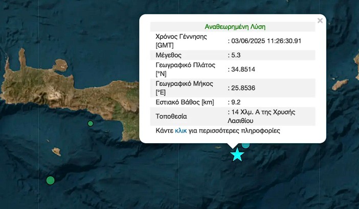 Σύμφωνα με το Γεωδυναμικό Ινστιτούτο, η σεισμική δόνηση ήταν μεγέθους 5,3 Ρίχτερ, με επίκεντρο 14 χλμ Aνατολικά της Xρυσής, στη θαλάσσια περιοχή νότια του Λασιθίου. Το εστιακό βάθος του σεισμού βρισκόταν στα 9,2 χλμ.