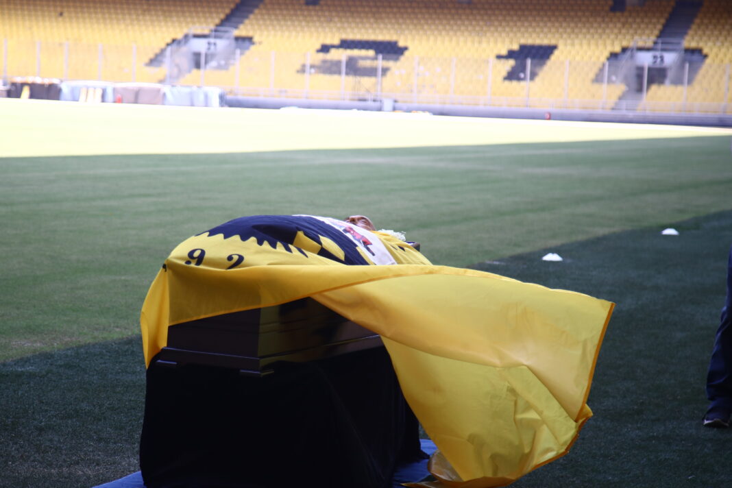 Η σορός του Χατζηχρήστου βρέθηκε εντός του γηπέδου και οι οργανωμένοι οπαδοί των Κιτρινόμαυρων τον αποχαιρέτησαν με συνθήματα σε συγκινησιακό κλίμα, μπροστά στη δακρυσμένη σύζυγό του.