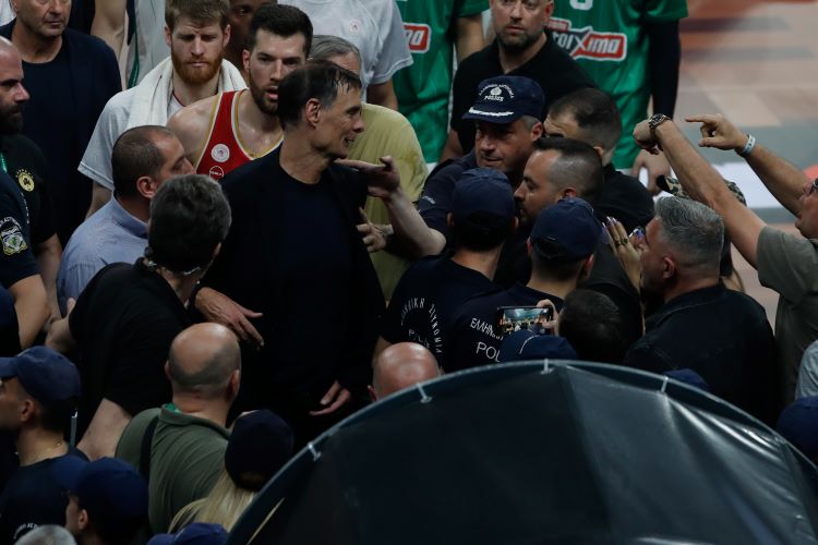 Στο τέλος του αγώνα και ακριβώς στο ίδιο σημείο, αντικείμενο εκσφενδονίστηκε προς το μέρος του προπονητή του Ολυμπιακού.