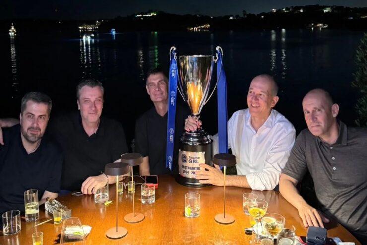 «Οι Πρόεδροι Παναγιωτης και Γιώργος Αγγελοπουλος, ο προπονητής, Γιώργος Μπαρτζώκας, ο Γενικός Διευθυντής, Νίκος Λεπενιώτης και ο Sports Director, Χρήστος Μπαφές, πόζαραν με την… πρωταγωνίστρια της βραδιάς, την Κούπα».