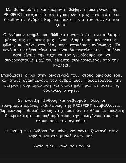 Η εταιρεία αποχαιρέτησε τον Πατρινό συνεργάτη της με ένα μήνυμα στο Instagram: «Με βαθιά οδύνη και απέραντη θλίψη, η οικογένεια της PROSPORT αποχαιρετά τον αγαπημένο μας συνεργάτη και διευθυντή, Ανδρέα Κυριακόπουλο, μετά τον ξαφνικό του χαμό.