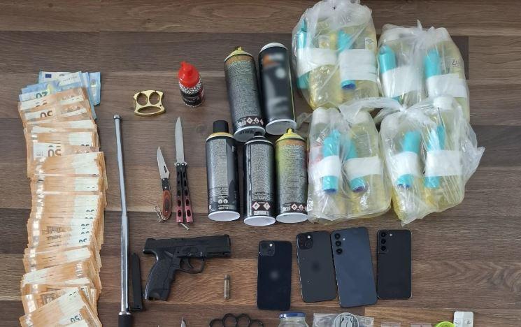 Σε έρευνες, μεταξύ άλλων, βρέθηκαν και κατασχέθηκαν -8- αυτοσχέδιοι εκρηκτικοί μηχανισμοί, -3- σιδερογροθιές, -2- μαχαίρια τύπου πεταλούδα, -2- αναδιπλούμενοι σουγιάδες, ξιφίδιο, κατσαβίδι, αεροβόλο πιστόλι, καθώς και το χρηματικό ποσό των -17.797,5- ευρώ