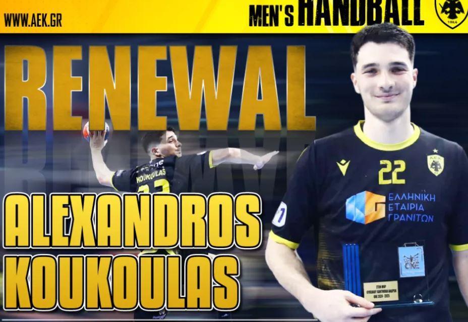 «Η ΑΕΚ βρίσκεται στην ευχάριστη θέση να ανακοινώσει την ανανέωση της συνεργασίας της με τον Αλέξανδρο Κουκουλά. Ο 22χρονος ίντερ (13/05/2003) υπέγραψε το νέο του συμβόλαιο και θα παραμείνει στο δυναμικό της ανδρικής ομάδας Χάντμπολ του Συλλόγου και την επόμενη χρονιά.