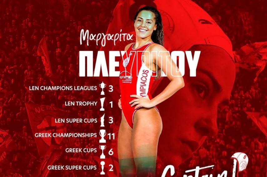Χωριστούς δρόμους τραβούν η Μαργαρίτα Πλευρίτου και ο Ολυμπιακός μετά από 14 χρόνια κοινής πορείας και 26 τρόπαια στο πόλο Γυναικών.