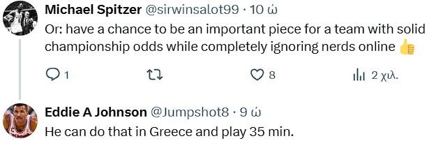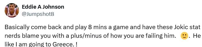 «Βασικά να επιστρέψεις για να παίζεις οκτώ λεπτά ανά παιχνίδι και να έχεις τους οπαδούς του Γιόκιτς που κρατούν στατιστικά να σε κατηγορούν ότι τον απογοητεύεις. Εκείνος λέει “πηγαίνω στην Ελλάδα”», ανέφερε η ανάρτηση του Έντι Τζόνσον.
