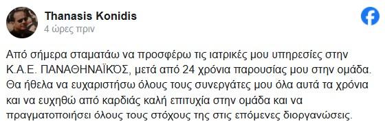 «Από σήμερα σταματάω να προσφέρω τις ιατρικές μου υπηρεσίες στην ΚΑΕ Παναθηναϊκός, μετά από 24 χρόνια παρουσίας μου στην ομάδα. Θα ήθελα να ευχαριστήσω όλους τους συνεργάτες μου όλα αυτά τα χρόνια και να ευχηθώ από καρδιάς καλή επιτυχία στην ομάδα και να πραγματοποιήσει όλους τους στόχους της στις επόμενες διοργανώσεις», ανέφερε ο κ. Κονίδης.