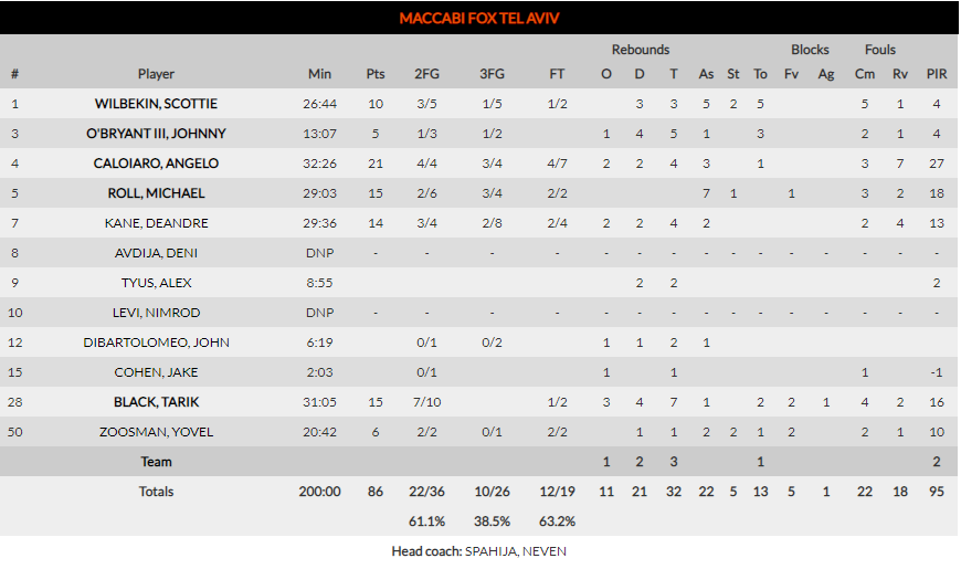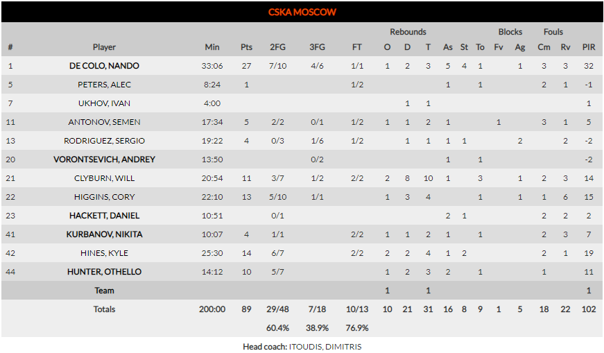 Η ρωσική «αρκούδα» είχε σε μεγάλη βραδιά τον Γάλλο γκαρντ, Νάντο Ντε Κολό, ο οποίος σημείωσε 27 πόντους, με 4/6 τρίποντα, 7/10 δίποντα, 1/1 βολή, ενώ μοίρασε 5 ασίστ. Από την άλλη άλλη πλευρά, για τους γηπεδούχους ξεχώρισε ο Άντζελο Καλοϊάρο, ο οποίος σκόραρε 21 πόντους με 3/4 τρίποντα, 4/4 δίποντα και 4/7 ελεύθερος βολές.