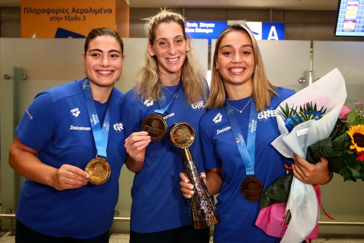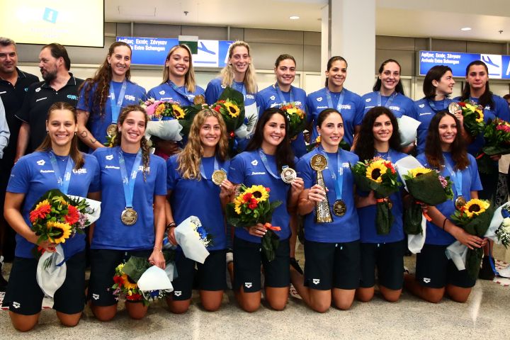 Με πολλά χαμόγελα και τα χρυσά μετάλλια στο στήθος επέστρεψε το πρωί της Παρασκευής (25/7) στην Ελλάδα η εθνική ομάδα πόλο γυναικών.