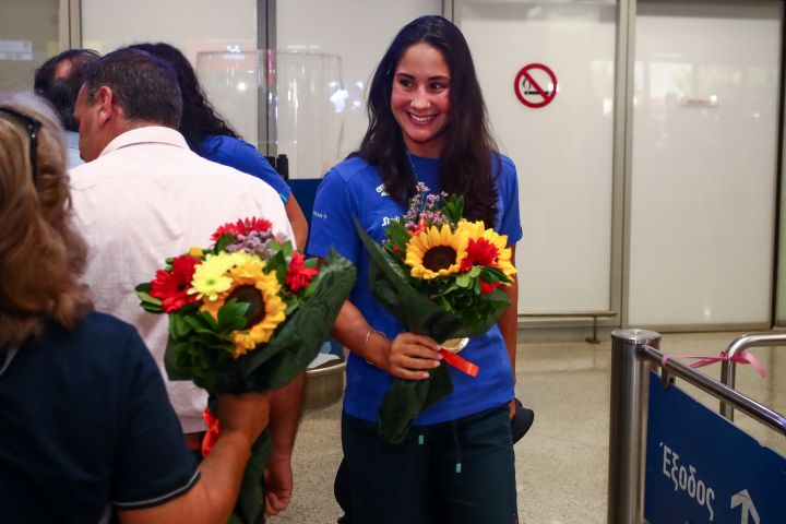 Το χαμόγελο στο πρόσωπο των χρυσών κοριτσιών δεν κρυβόταν, όπως και τα χρυσά μετάλλια που δεν κατέβηκαν από το στήθος τους. Στο αεροδρόμιο τις υποδέχθηκε ο Γιώργος Μαυρωτάς.