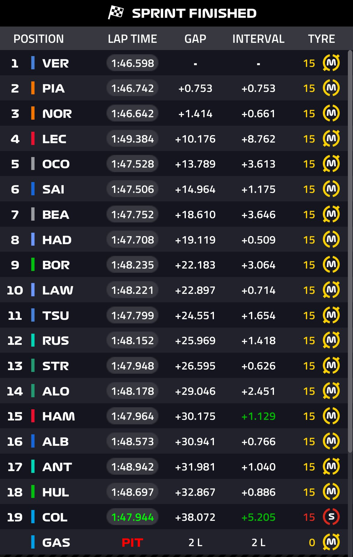 Ο Μαξ Φερστάπεν έδειξε γιατί είναι ο πρωταθλητής της Formula 1 και με προσπέραση στην εκκίνηση του σπριντ άφησε πίσω του τον Όσκαρ Πιάστρι και στη συνέχεια άντεξε στην πίεση του Αυστραλού για να πάρει τη νίκη στο σπριντ του Grand Prix του Βελγίου. Ακολούθησαν Νόρις και Λεκλέρ.