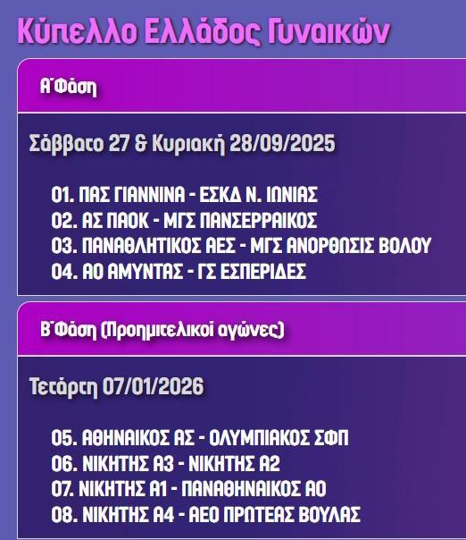 Αναλυτικά τα ζευγάρια της Α’ και Β’ φάσης του Κυπέλλου Γυναικών: