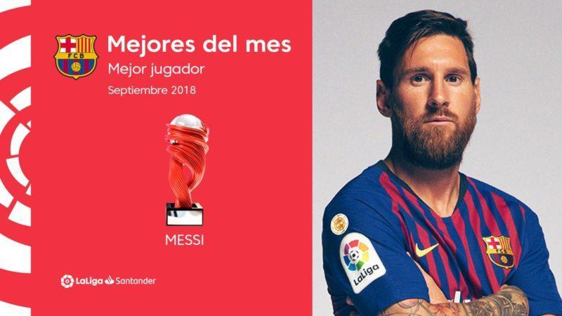 Με τρία γκολ συνολικά, δύο εκ των οποίων τα πέτυχε στη νίκη απέναντι στην Ουέσκα (8-2) κι ένα στην ισοπαλία κόντρα στην Χιρόνα (2-2), ο Λιονέλ Μέσι πήρε το βραβείο του καλύτερου ποδοσφαιριστή για το μήνα Σεπτέμβρη στο ισπανικό πρωτάθλημα. Παράλληλα, ο Αργεντινός μοίρασε και τέσσερις ασίστ βοηθώντας έτσι την ομάδα του να βρεθεί στην κορυφή του βαθμολογικού πίνακα.