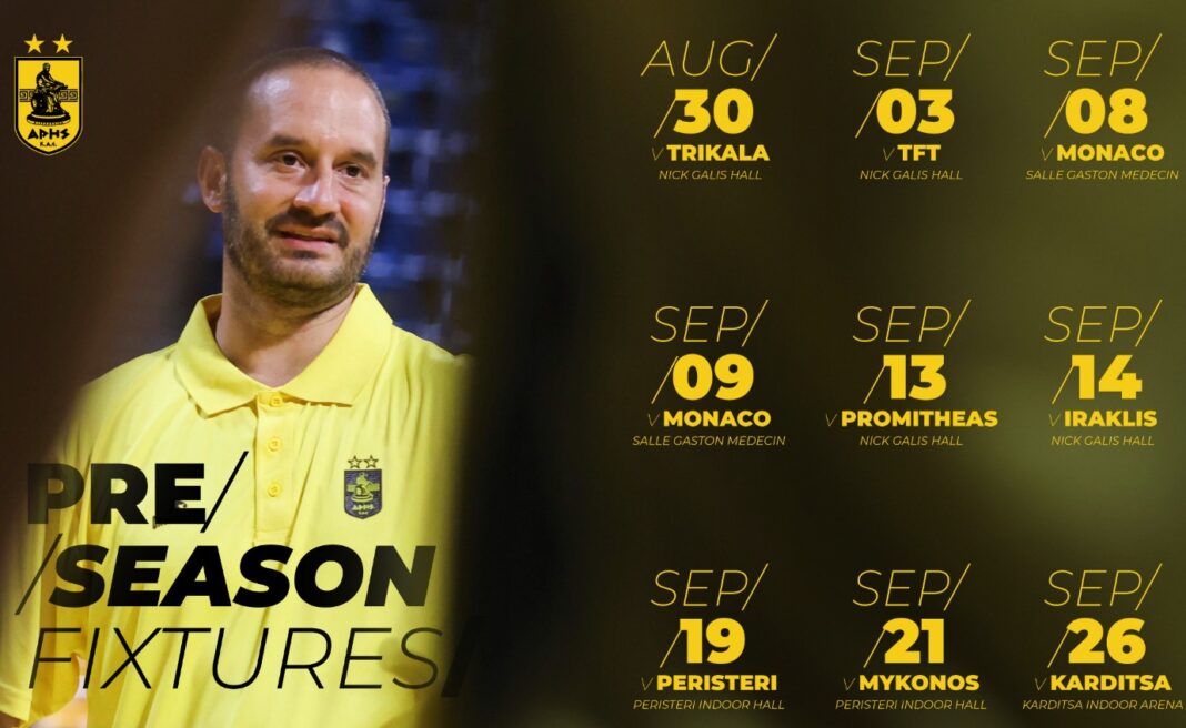 Στις 13 Σεπτεμβρίου, στο πλαίσιο του τουρνουά «Συμεών Μαυροσκούφης», ο ΑΡΗΣ θα αντιμετωπίσει στο «Nick Galis Hall» τον Προμηθέα Πάτρας. Μία μέρα αργότερα, στις 14 Σεπτεμβρίου, στο πλαίσιο του ίδιου τουρνουά, η ομάδα του Bogdan Karaicic θα αγωνιστεί με τον Ηρακλή, και πάλι στο «Nick Galis Hall».