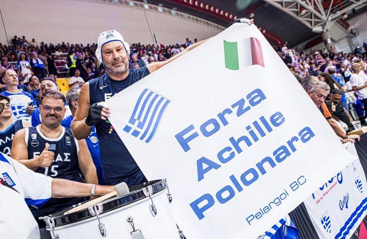 «Forza Αchille Polonara», έγραφε το πανό που κρατούσαν στα χέρια τους οι Πελαργοί στη διάρκεια του αγώνα της εθνικής με τη σκουάντρα ατζούρα, ενώ όταν οι Ιταλοί παίκτες πλησίασαν προς τη γαλανόλευκη εξέδρα, φώναξαν ρυθμικά το όνομά του.
