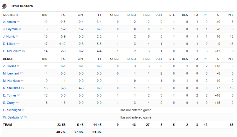 Πρωταγωνιστής από την μεριά των Λέικερς είναι ο Λεμπρόν Τζέιμς με 18 πόντους (6-10 σουτ), 7 ριμπάουντ, 3 ασίστ και 1 κλέψιμο, ενώ από κείνη των Μπλέιζερς, ο Νικ Στάουσκας έχει πετύχει 16 πόντους (6-8 σουτ) σε μόλις 13 λεπτά συμμετοχής.