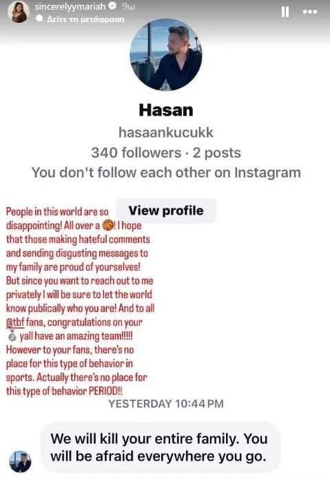 «Οι άνθρωποι σε αυτόν τον κόσμο είναι τόσο απογοητευτικοί! Όλο αυτό για το μπάσκετ. Ελπίζω όσοι κάνουν σχόλια μίσους και στέλνουν αηδιαστικά μηνύματα στην οικογένειά μου να είναι περήφανοι για τον εαυτό τους! Αλλά επειδή θέλετε να επικοινωνήσετε μαζί μου ιδιωτικά, θα φροντίσω να ενημερώσω τον κόσμο δημόσια για το ποιοι είστε! Και σε όλους τους οπαδούς της Τουρκίας, συγχαρητήρια για το ασημένιο μετάλλιο σας, έχετε μια καταπληκτική ομάδα! Ωστόσο, δεν υπάρχει χώρος για τέτοιου είδους συμπεριφορά στον αθλητισμό. Στην πραγματικότητα, δεν υπάρχει χώρος για τέτοιου είδους συμπεριφορά ΤΕΛΟΣ».