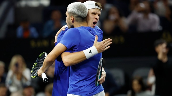 Ο Ισπανός πρωταθλητής, ο οποίος ανέκτησε την πρώτη θέση στην παγκόσμια κατάταξη στο απλό με τη νίκη του στο U.S. Open επί του Γιανίκ Σίνερ αυτόν τον μήνα, συνεργάστηκε με τον Γιακούμπ Μενσίκ και οδήγησε την Team Europe σε μια νίκη με 7-6(7) 6-4 επί των Τέιλορ Φριτς και Άλεξ Μίκελσεν στον τελευταίο αγώνα της ημέρας.