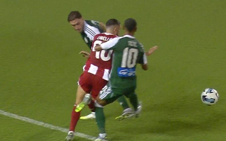 Η πρώτη φάση που ξεσήκωσε αντιδράσεις καταγράφηκε στο 35ο λεπτό όταν ο Καμπελά πέταξε την μπάλα από τα αριστερά και έφυγε για την περιοχή του Παναθηναϊκού κινούμενος ανάμεσα σε Καλάμπρια και Τετέ. Ο Βραζιλιάνος μεσοεπιθετικός τον βρήκε με το γόνατο στο πόδι και τον γκρέμισε αλλά ο Γερμανός δεν έδειξε το πέναλτι και αντ’ αυτού έβγαλε κίτρινη κάρτα στον Γάλλο μεσοεπιθετικό για θέατρο. Το πιο προκλητικό από όλα όμως είναι πως η φάση δεν εξετάστηκε δευτερόλεπτο από τον VAR Μάρτιν Γκούντερ Αλεξάντερ Περλ, ενώ ο πάγκος του Ολυμπιακού ξέσπασε σε διαμαρτυρίες μαζί με τον Καμπελά που δεν πίστευε στην απόφαση.