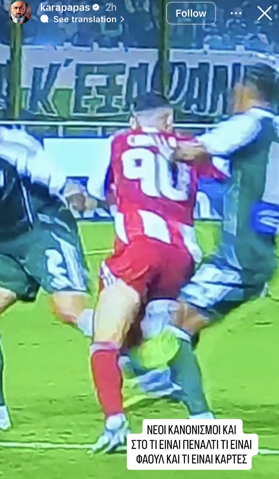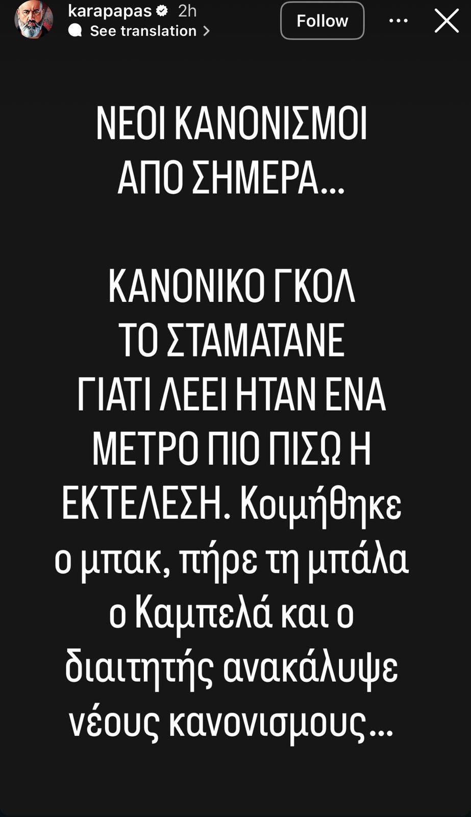 Αναλυτικά όσα αναφέρει: «Νέοι κανονισμοί από σήμερα… Κανονικό γκολ το σταματάνε γιατί λέει ήταν ένα μέτρο πιο πίσω η εκτέλεση. Κοιμήθηκε ο μπακ, πήρε την μπάλα ο Καμπελά και ο διαιτητής ανακάλυψε νέους κανονισμούς. Νέοι κανονισμοί και στο τι είναι πέναλτι, τι είναι φάουλ και τι είναι κάρτες».