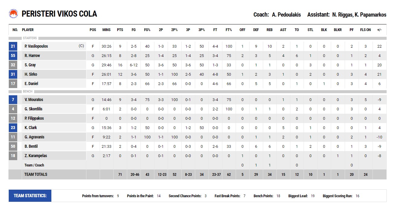 Ο Αργύρης Πεδουλάκης φαίνεται ότι έχει κάνει καταπληκτική δουλειά στην ομάδα του Περιστερίου, καθώς έχει περάσει την ταυτότητά του και δείχνει ότι το Περιστέρι φέτος είναι αποφασισμένο κι έχει την ικανότητα να πρωταγωνιστήσει. Στα του παιχνιδιού σε συνολική διάρκεια οι γηπεδούχοι ήταν καλύτεροι και δίκαια κέρδισαν το ματς.
