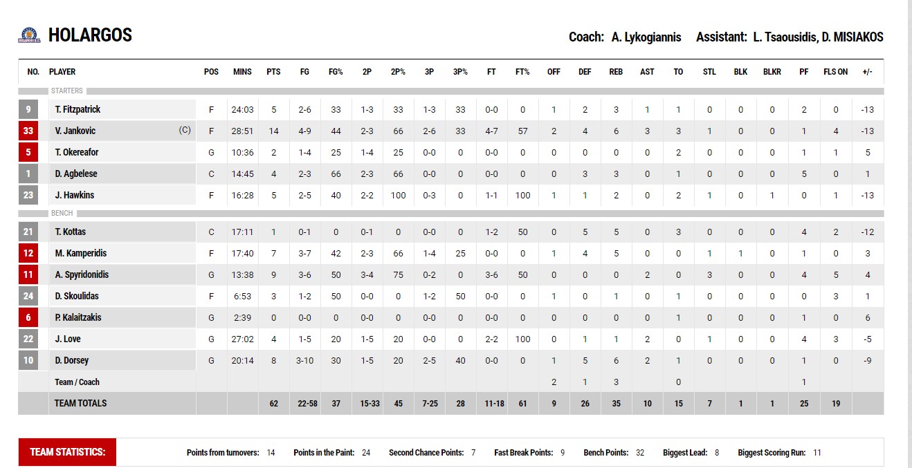 Ουσιαστικά ο Χολαργός ήταν ανταγωνιστικός για ένα ημίχρονο, όμως το Περιστέρι μ’ ένα εξαιρετικό τρίτο δεκάλεπτο (27-11 επιμέρους σκορ) κατάφερε να βάλει τις βάσεις και να πάρει κεφάλι στο ματς. Έπειτα διαχειρίστηκε σωστά την κατάσταση και με κορυφαίο τον Γκρέι (16 πόντους) κατάφερε να κερδίσει το ματς και να πάει στην πρώτη θέση της Basket League.