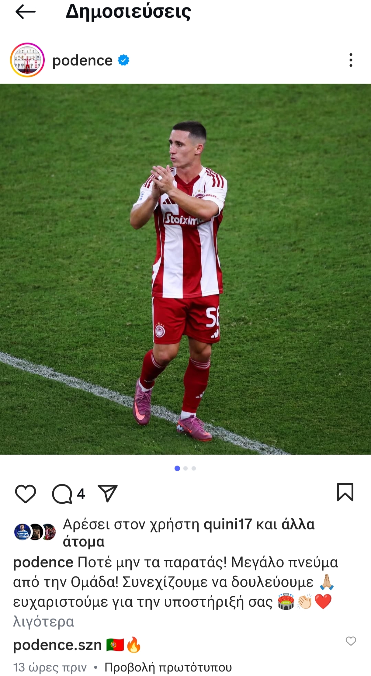 Ο 29χρονος διεθνής Πορτογάλος αριστερός εξτρέμ ευχαρίστησε τον κόσμο που βρέθηκε στο πλευρό των Ερυθρόλευκων στην αναμέτρηση με τον Λεβαδειακό (3-2) το περασμένο Σάββατο (27/09) στο γήπεδο «Γεώργιος Καραϊσκάκης» στο πλαίσιο της πέμπτης αγωνιστικής της Super League.