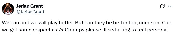 «Μπορούμε να παίξουμε καλύτερα και θα το κάνουμε. Αλλά, ελάτε, κι εκείνοι μπορούν να είναι καλύτεροι. Μπορούμε να έχουμε λίγο σεβασμό ως επτά φορές πρωταθλητές Ευρώπης παρακαλώ; Έχει αρχίσει να μοιάζει προσωπικό», έγραψε ο Αμερικανός γκαρντ των Πρασίνων για την απόδοση των διαιτητών στην ήττα της ομάδας του από τους Βάσκους.