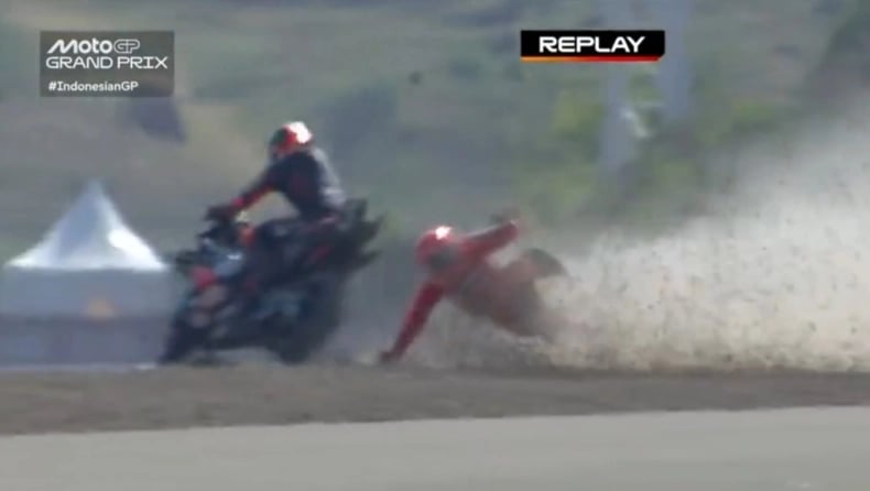 Ο Μπετσέκι-νικητής χθες (4/10) των αγώνα σπριντ-, ο οποίος ξεκίνησε από την pole position, άγγιξε τον πίσω τροχό του Μαρκ Μαρκέθ, που είχε μόλις στεφθεί παγκόσμιος πρωταθλητής για έβδομη φορά την περασμένη εβδομάδα στην Ιαπωνία, και οι δύο τους έπεσαν βίαια.