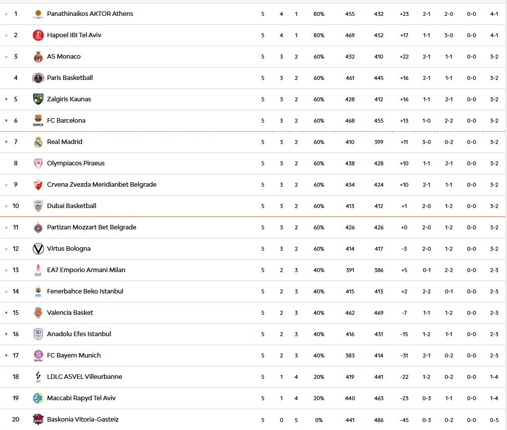 Η ΒΑΘΜΟΛΟΓΙΑ ΤΗΣ EUROLEAGUE ΜΕΤΑ ΤΗΝ ΟΛΟΚΛΗΡΩΣΗ ΤΗΣ 5ης ΑΓΩΝΙΣΤΙΚΗΣ