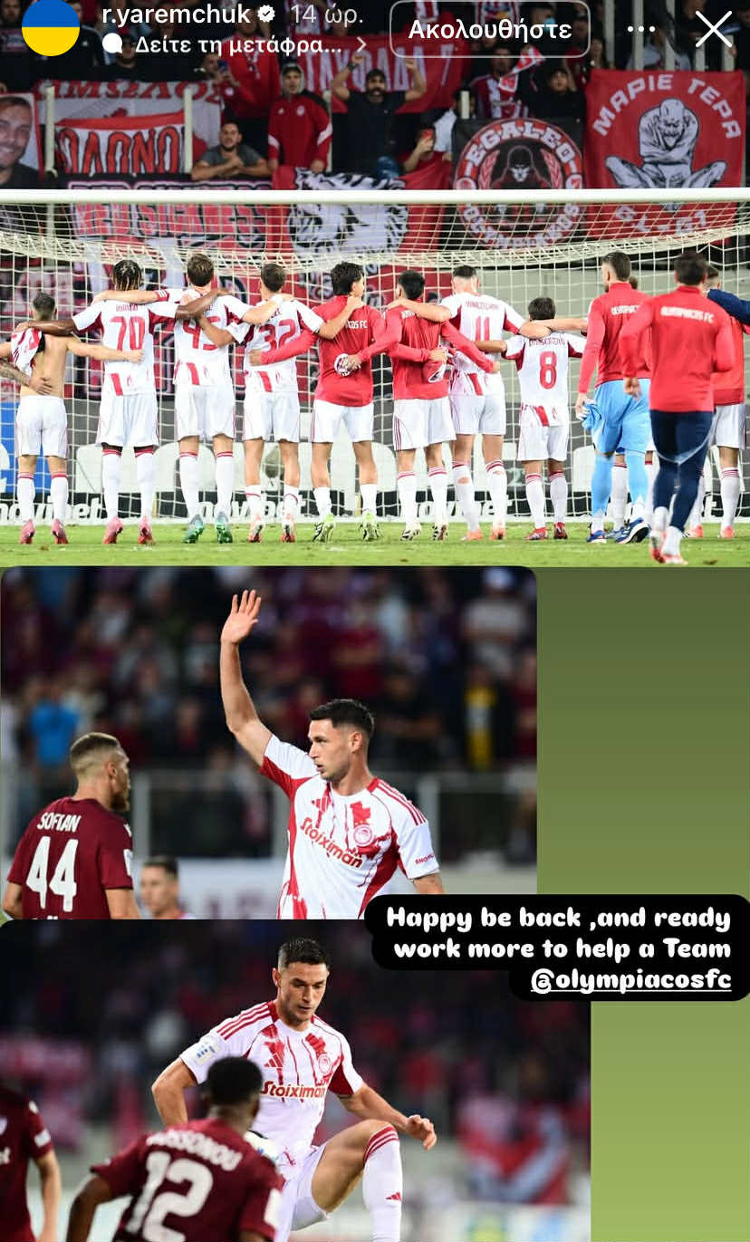 Σε ανάρτησή του μετά το παιχνίδι στη Θεσσαλία ο Γιάρεμτσουκ δήλωσε χαρούμενος για την επιστροφή του αλλά και έτοιμος να δουλέψει ακόμα περισσότερο για να βοηθήσει την ομάδα του, όπως ανέφερε χαρακτηριστικά.