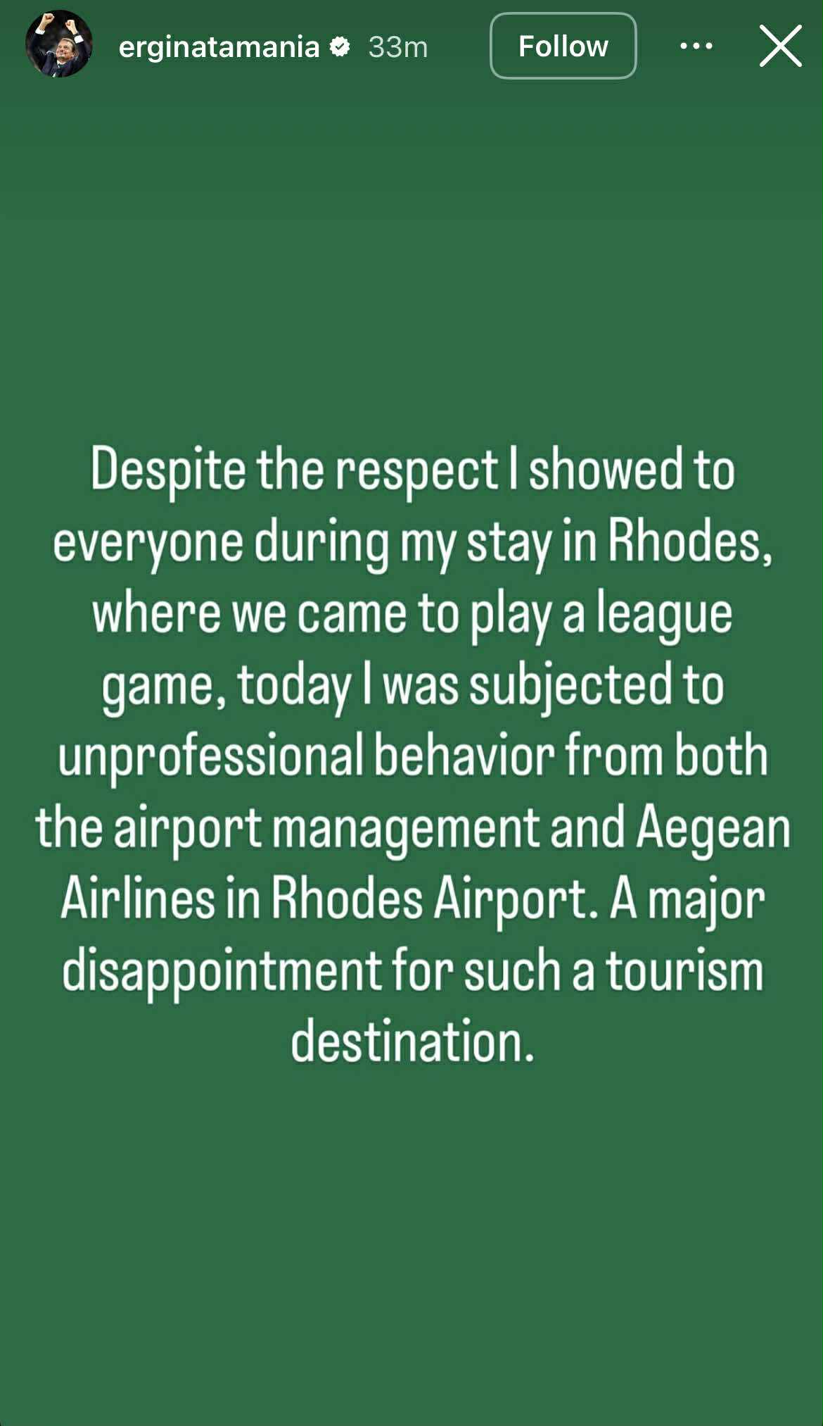 «Παρά τον σεβασμό που έδειξα σε όλους κατά τη διάρκεια της παραμονής μου στη Ρόδο, όπου βρεθήκαμε για να παίξουμε ένα παιχνίδι πρωταθλήματος, σήμερα βίωσα αντιεπαγγελματική συμπεριφορά τόσο από τη διοίκηση του αεροδρομίου, όσο και από την Aegean Airlines στο αεροδρόμιο της Ρόδου. Τεράστια απογοήτευση για έναν τόσο τουριστικό προορισμό», έγραψε ο Τούρκος προπονητής.