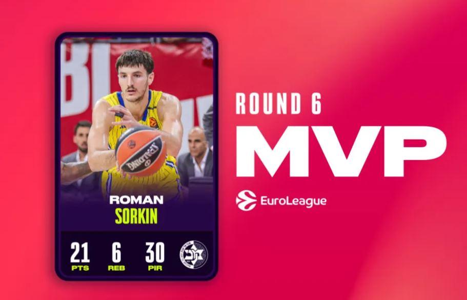 Το πρώτο MVP βραβείο της καριέρας του απέσπασε ο Ρόμαν Σόρκιν για την 6η αγωνιστική της EuroLeague. Ο Ισραηλινός σέντερ με τα 129 παιχνίδια καριέρας στην κορυφαία διοργάνωση, αναδείχθηκε ο πολυτιμότερος της αγωνιστικής στη νίκη της Μακάμπι με 92-91 απέναντι στη Ρεάλ Μαδρίτης.