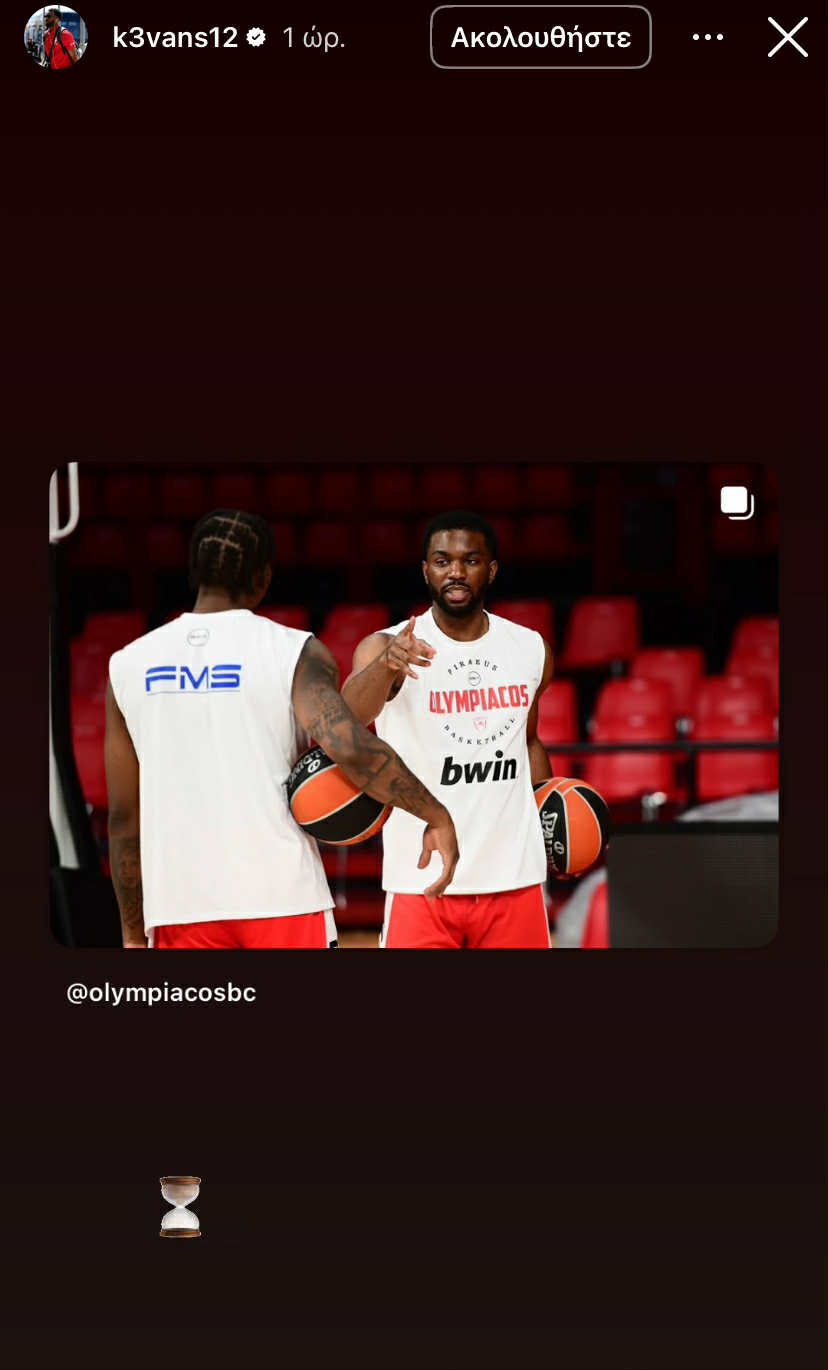 Μάλιστα, μετά την προπόνηση της Τρίτης και μία μέρα πριν τον αγώνα με τη Μονακό στο ΣΕΦ (29/10), ο Έβανς ανέβασε ένα instagram story -από τις σπάνιες δημοσιεύσεις του στο τελευταίο διάστημα- στο οποίο έβαλε μία κλεψύδρα, με τον χρόνο να μετρά πλέον αντίστροφα και υπέρ τόσο του ίδιου όσο και του Ολυμπιακού που περιμένει μία έξτρα ποιοτική «προσθήκη» στις θέσεις των γκαρντ.