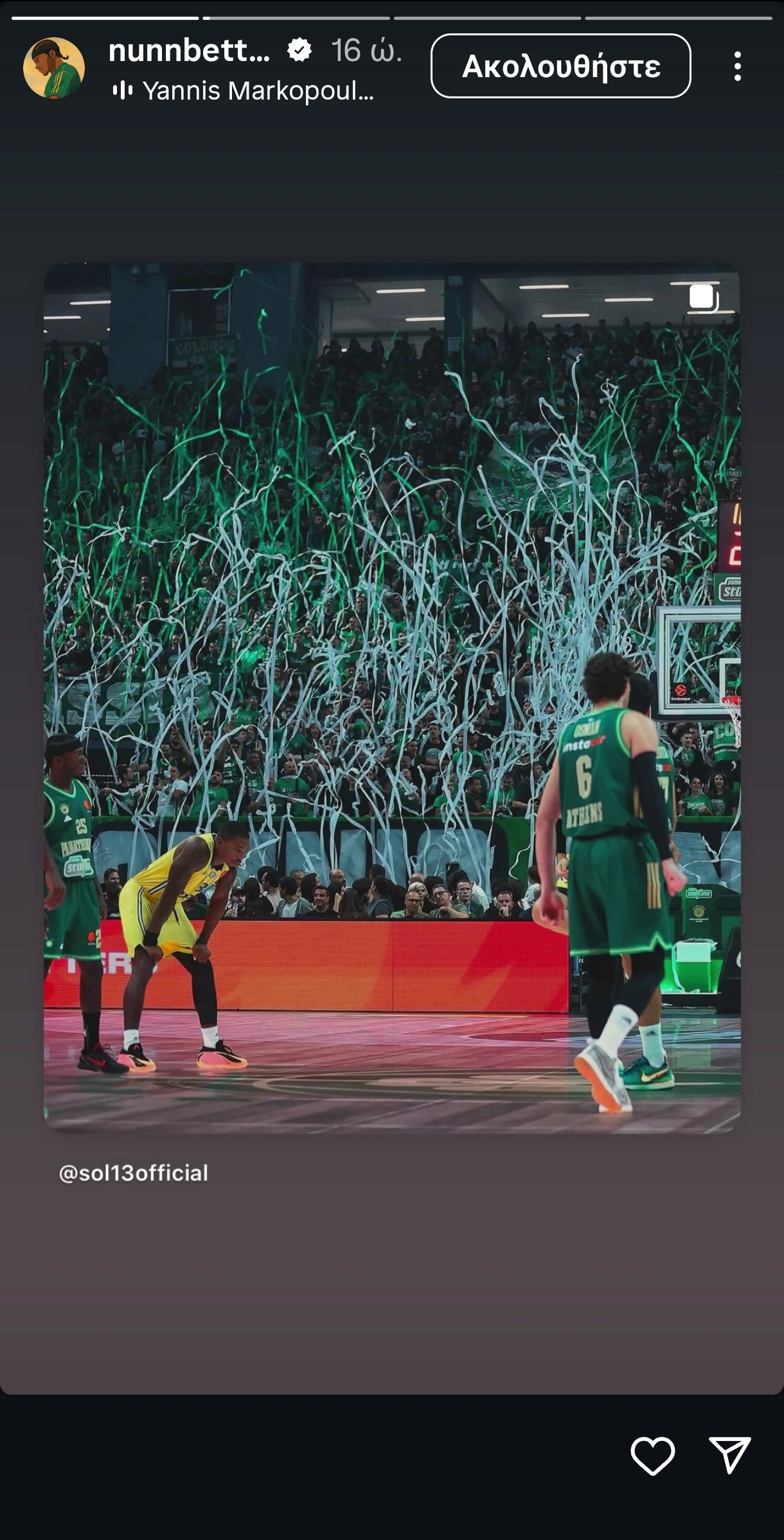 Μάλιστα, ο 30χρονος Αμερικανός γκαρντ (1,95 μέτρα) του Τριφυλλιού αφιέρωσε story στο Instagram στη Θύρα 13, με μια φωτογραφία από την εξέδρα και ηχητική υπόκρουση το τραγούδι «Μαλαματένια λόγια» του Γιάννη Μαρκόπουλου.