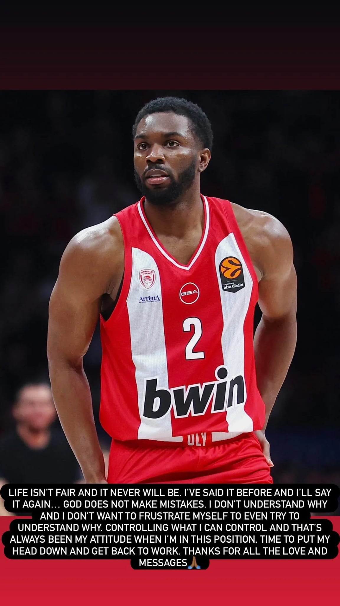 Σε αυτό ο Αμερικανός γκαρντ αναφέρει με όση υπομονή και δύναμη τού έχει απομείνει -που φαίνεται ότι έχει αρκετό απόθεμα- ότι η ζωή δεν είναι δίκαιη και ποτέ δεν θα είναι ενώ προσθέτει πως θα ριχτεί και πάλι στη δουλειά με στόχο να επιστρέψει. Αγωνιστής, με όλη την έννοια της λέξης.