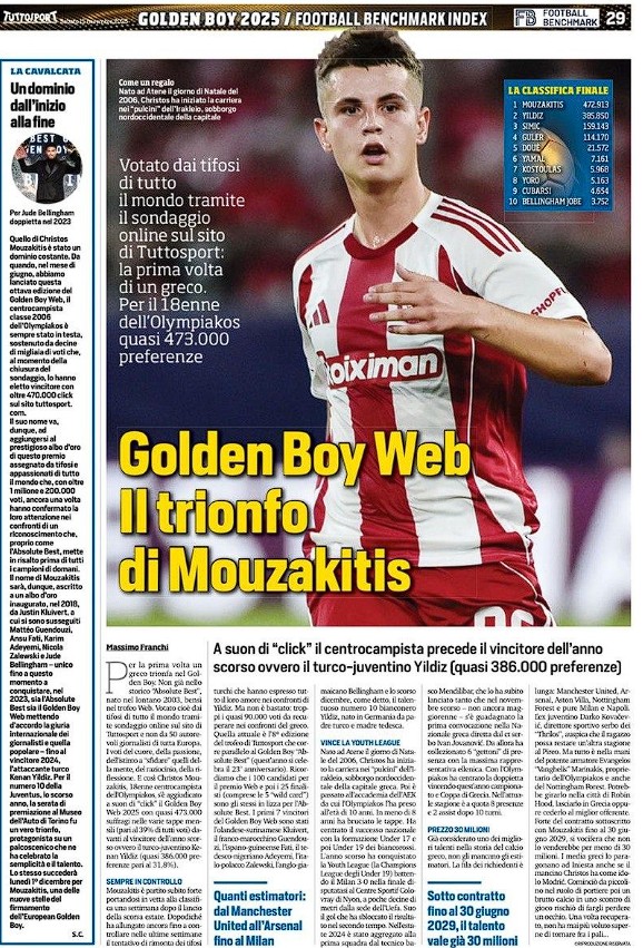 «Για πρώτη φορά στην ιστορία του θεσμού, ένας Έλληνας ποδοσφαιριστής θριαμβεύει στο βραβείο Golden Boy Web, το οποίο κρίνεται από τις ψήφους των φιλάθλων παγκοσμίως. Όχι στο ιστορικό βραβείο “Absolute Best”, που καθιερώθηκε το 2003, αλλά στο διαδικτυακό τρόπαιο . Ψήφοι οπαδών από όλο τον κόσμο σε μια διαδικτυακή ψηφοφορία στην ιστοσελίδα Tuttosport, όχι από 50 αξιοσέβαστους δημοσιογράφους από όλη την Ευρώπη, αλλά ψήφοι που δίνονται από καρδιάς, από το πάθος, το ένστικτο και αμφισβητούν εκείνες που δίνονται από το μυαλό, τη λογική, τη σκέψη. Έτσι, ο Χρήστος Μουζακίτης , ο 18χρονος μέσος του Ολυμπιακού, κέρδισε το βραβείο Web Golden Boy 2025 με το πάτημα ενός κουμπιού, συγκεντρώνοντας σχεδόν 473.000 ψήφους (39% του συνόλου) στους μηνιαίους γύρους της ψηφοφορίας. Άφησε πίσω του τον περσινό νικητή, τον Τούρκο άσο της Γιουβέντους, Κενάν Γιλντίζ, ο οποίος έλαβε περίπου 386.000 ψήφους (31,8%).