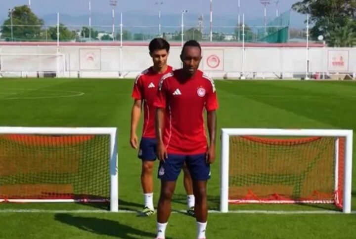 Οι δύο ποδοσφαιριστές του Ολυμπιακού τέθηκαν αντιμέτωποι σε ένα mini challenge, με στόχο σκοράρουν σε μικρά τερματάκι με την πλάτη γυρισμένη ανάποδα.
