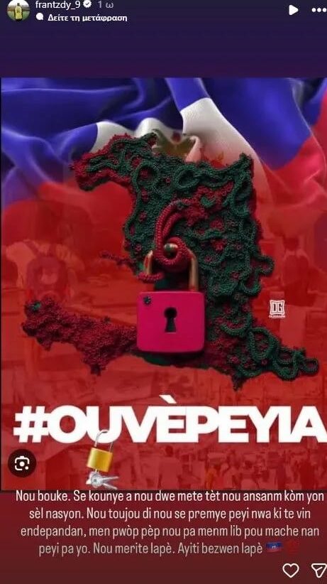 «Είμαστε κουρασμένοι. Τώρα πρέπει να ενωθούμε ως ένα έθνος. Πάντα λέμε ότι είμαστε η πρώτη μαύρη χώρα που γίνεται ανεξάρτητη, αλλά οι δικοί μας άνθρωποι δεν είναι καν ελεύθεροι να περπατήσουν στη χώρα τους. Αξίζουμε ειρήνη. Η Αϊτή χρειάζεται ειρήνη», έγραψε χαρακτηριστικά ο επιθετικός της ΑΕΚ στο instagram story του.
