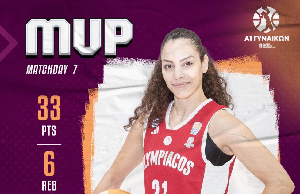 Η έμπειρη φόργουορντ των Ερυθρόλευκων αναδείχθηκε MVP για την 7η αγωνιστική της Α1 μπάσκετ Γυναικών αφού συγκέντρωσε 37 βαθμούς στο σύστημα αξιολόγησης και έδειξε πως βρίσκεται σε εξαιρετική κατάσταση.