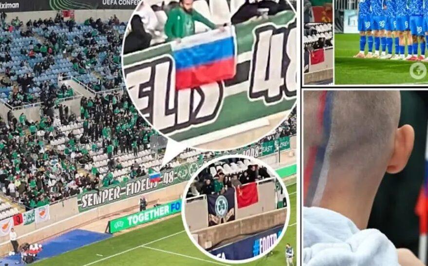 Στην πράσινη εξέδρα πίσω από το τέρμα του ΓΣΠ εμφανίστηκαν, κατά τη διάρκεια του αγώνα, μια τρίχρωμη ρωσική σημαία και μία κόκκινη σημαία της Σοβιετικής Ένωσης. Στα ίδια πλάνα διακρίνεται και φίλαθλος με μπλουζάκι που φέρει εμφανώς το γράμμα «Ζ», σύμβολο που έχει συνδεθεί με τη ρωσική εισβολή στην Ουκρανία και χρησιμοποιείται ως ένδειξη υποστήριξης της ρωσικής επιθετικότητας. Μετά από παρέμβαση των παρατηρητών του αγώνα, η ρωσική σημαία κατέβηκε, όμως η σοβιετική παρέμεινε αναρτημένη πίσω από την εστία μέχρι το τέλος του παιχνιδιού.