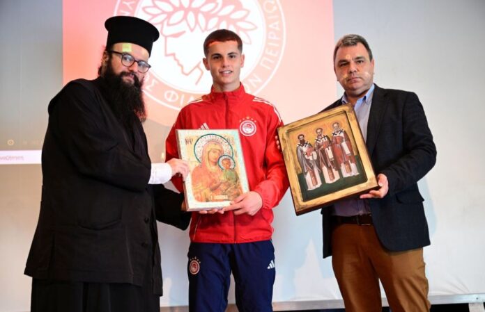 Ο Χρήστος Μουζακίτης παρέλαβε μια εικόνα της Παναγίας από τον Πνευματικό Σύμβουλο των Εκπαιδευτηρίων και μια εικόνα των Τριών Ιεραρχών, με τον κ. Αλφιέρη να απευθύνεται στον ποδοσφαιριστή μας, λέγοντάς του: «Επειδή βρίσκεσαι σε ένα χώρο εκπαιδευτικό, στα εκπαιδευτήρια της Ιεράς Μητροπόλεως Πειραιώς, που φροντίζουν να χτίζουν χαρακτήρες, που φροντίζουν με αίσθημα ευθύνης να μεταλαμπαδεύουν τη γνώση, δημιουργώντας προϋποθέσεις έτσι ώστε να μην σβήνουν οι αξίες και τα ιδανικά του έθνους και του λαού, σου προσφέρουμε ως ελάχιστο δείγμα ευγνωμοσύνης για τη σημερινή σου παρουσία την εικόνα των Τριών Ιεραρχών, που είναι οι προστάτες της εκπαίδευσης».