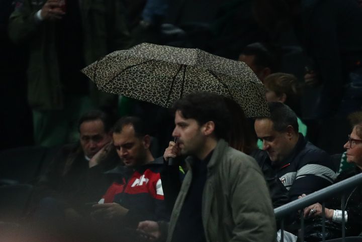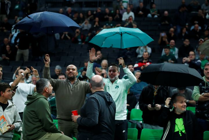 Οι φίλοι του τριφυλλιού πήραν θέση στις κερκίδες του ΟΑΚΑ για να παρακολουθήσουν την αναμέτρηση και αρκετοί από αυτούς αποφάσισαν να ανοίξουν ομπρέλες, μετά τη χθεσινή αναβολή στο Ολυμπιακός – Φενέρ με απόφαση της Πολιτείας για τα ακραία καιρικά φαινόμενα που έπληξαν τη μισή χώρα.